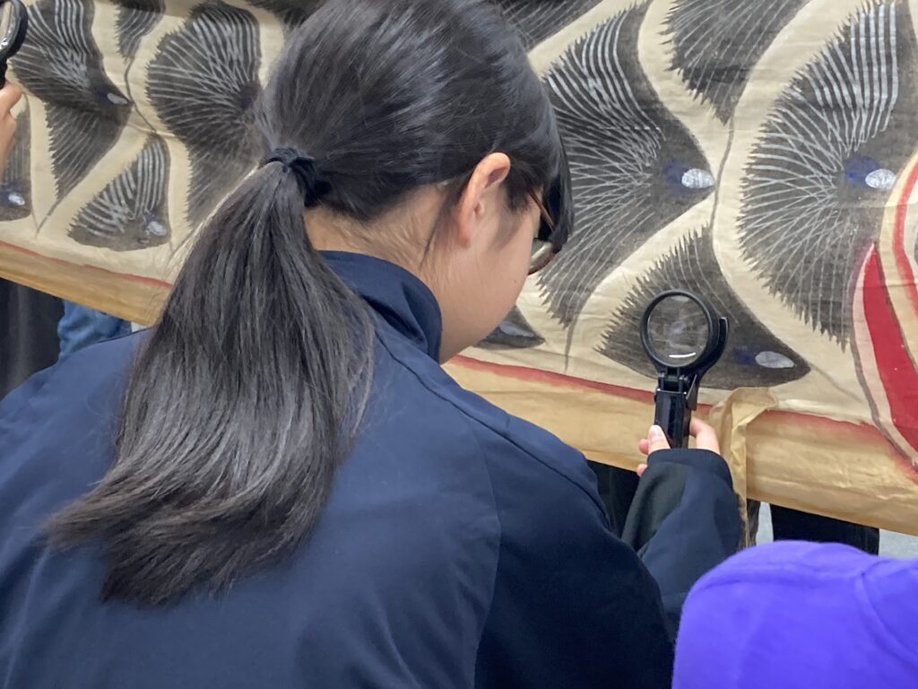 修復でも同じですが、離れて全体を見ることで気づくこと、近くで肉眼で見ることでわかること、さらに顕微鏡や分析機器を使って初めて見えてくることなど、観察にはさまざまな段階があります。まずは鯉のぼりから遠く離れた位置に一列に並んでもらいました。そこから、気づきを一つ発言するごとに一歩前へ進みます。距離が近くなるにつれて、ルーペを使えるというルールにしました。