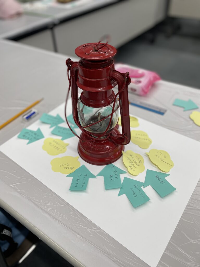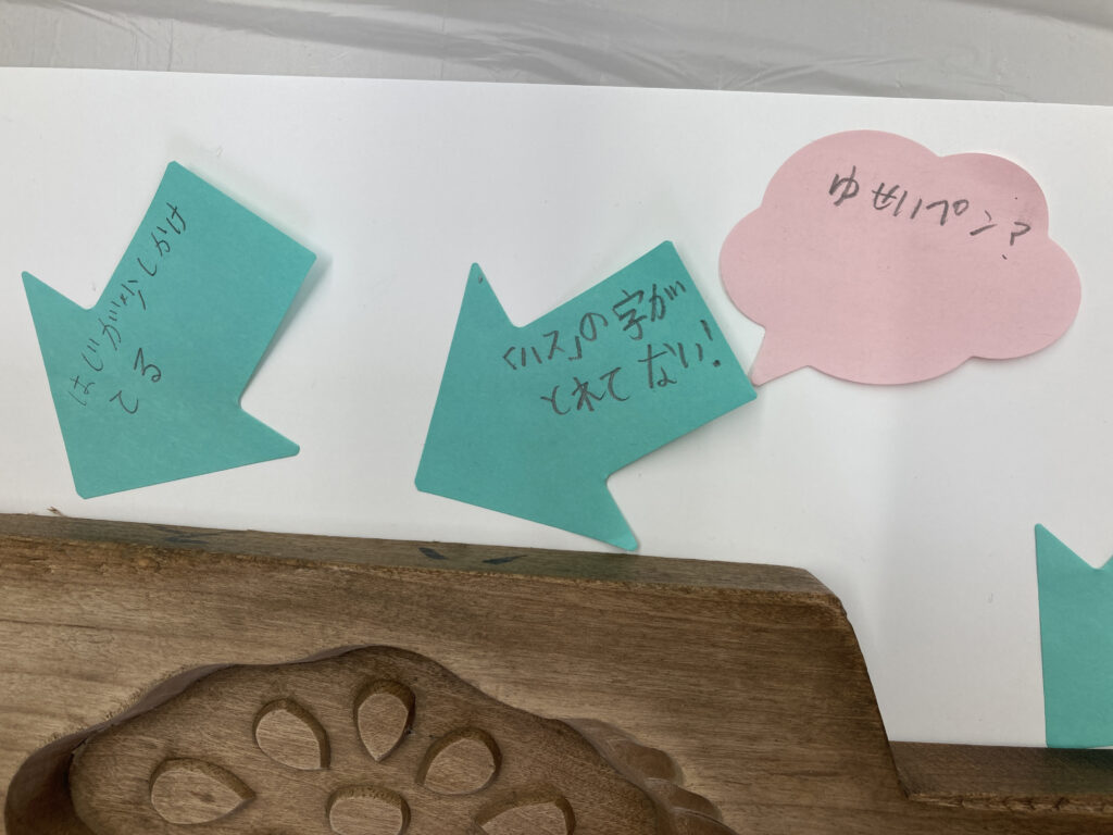 観察の中で見つけたことや、「あれ?」と感じた疑問を、矢印や吹き出しの形をした付箋に書き、該当する場所の近くに貼ってもらいました。資料の周りが付箋でいっぱいになるほど、多くの気づきが集まりました。