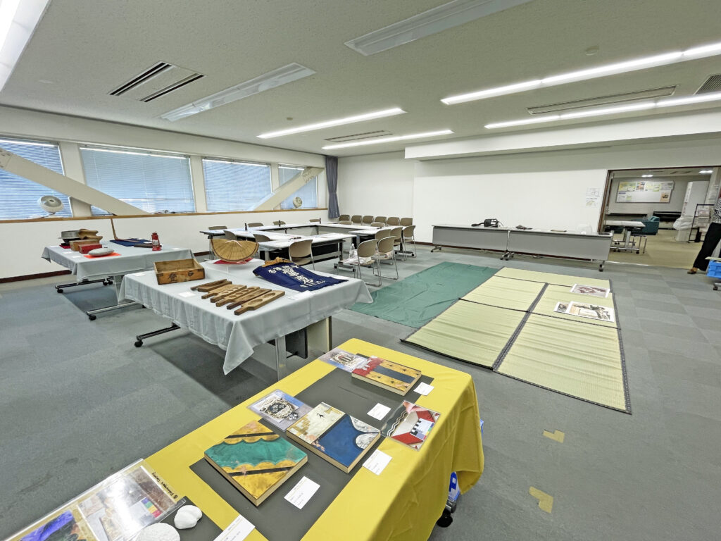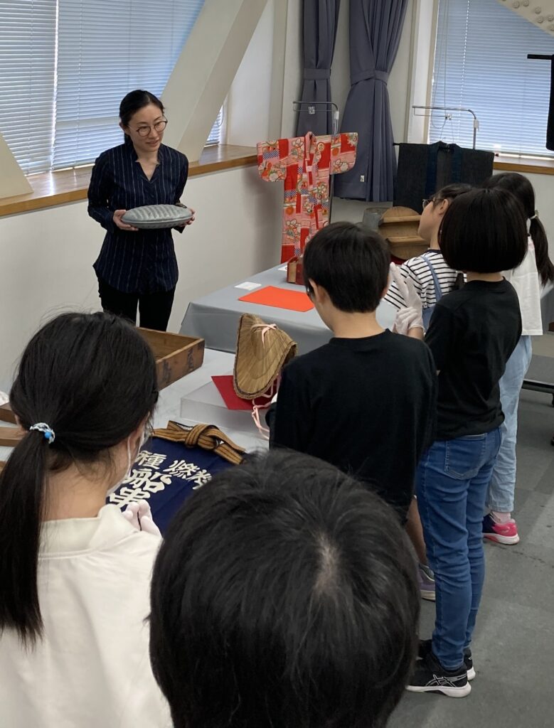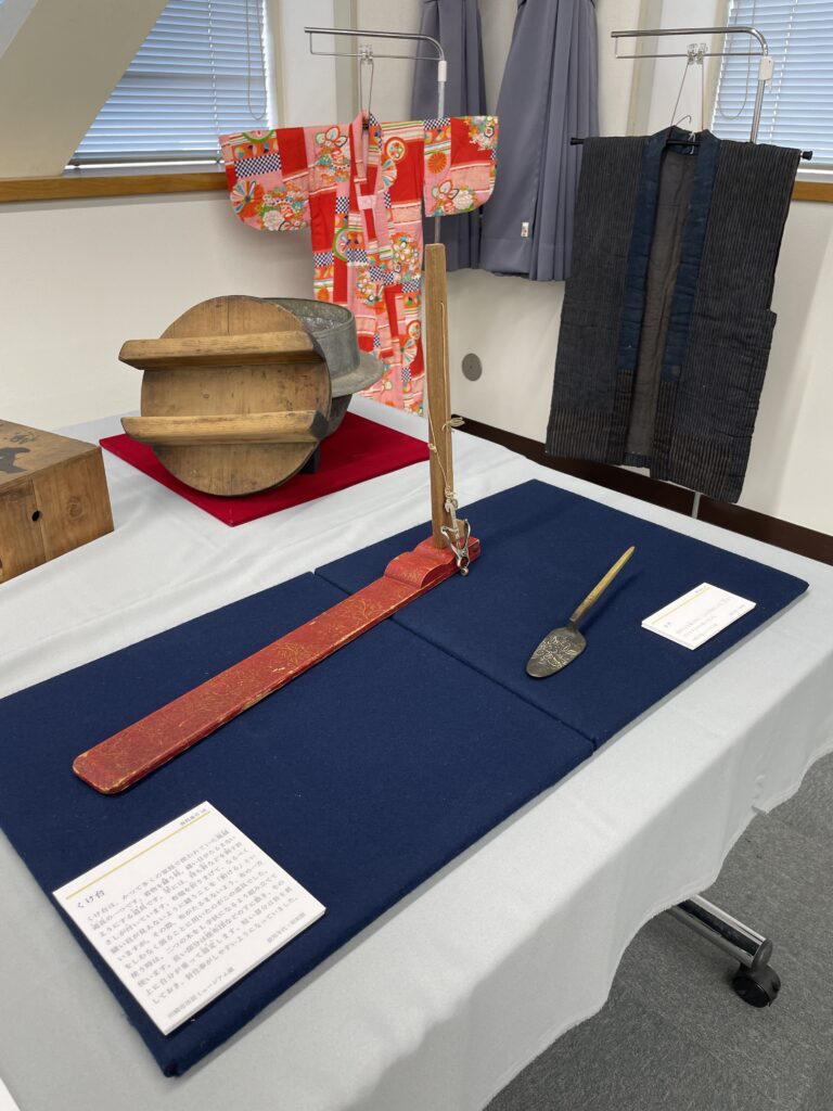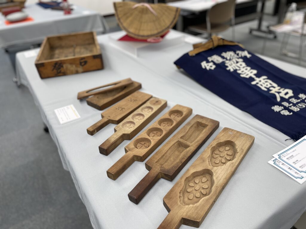 当日、会場の一角には、ミュージアムに寄贈されたさまざまな資料が並びました。これらは、川崎市内にお住まいの方が昭和期に使用していた道具を寄贈されたものだそうです。着物やお菓子の木型、前掛け、そして「くけ台」という裁縫に使う見慣れない道具まで、さまざまなものが並びました。
