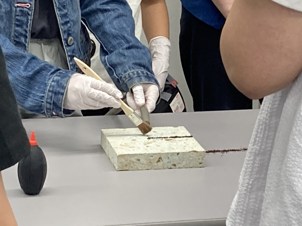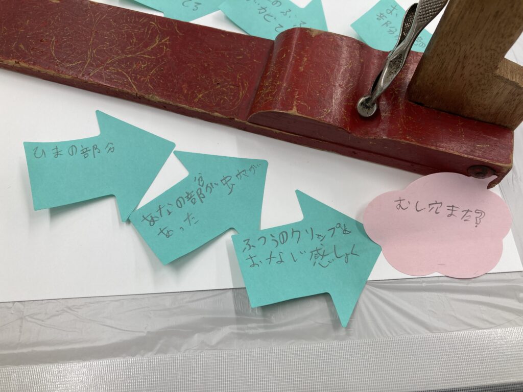 修復において、観察はとても大切です。ワークショップのタイトルにある「コンサバターはモノの探偵!?」という言葉は、修復では、ものをよく観察し、そこに残された痕跡から過去の環境や出来事を推測していくことが、探偵に似ていると、以前ブログに書いたことがきっかけになっています。その内容に学芸員さんが共感してくださり、今回のワークショップのタイトルになりました。