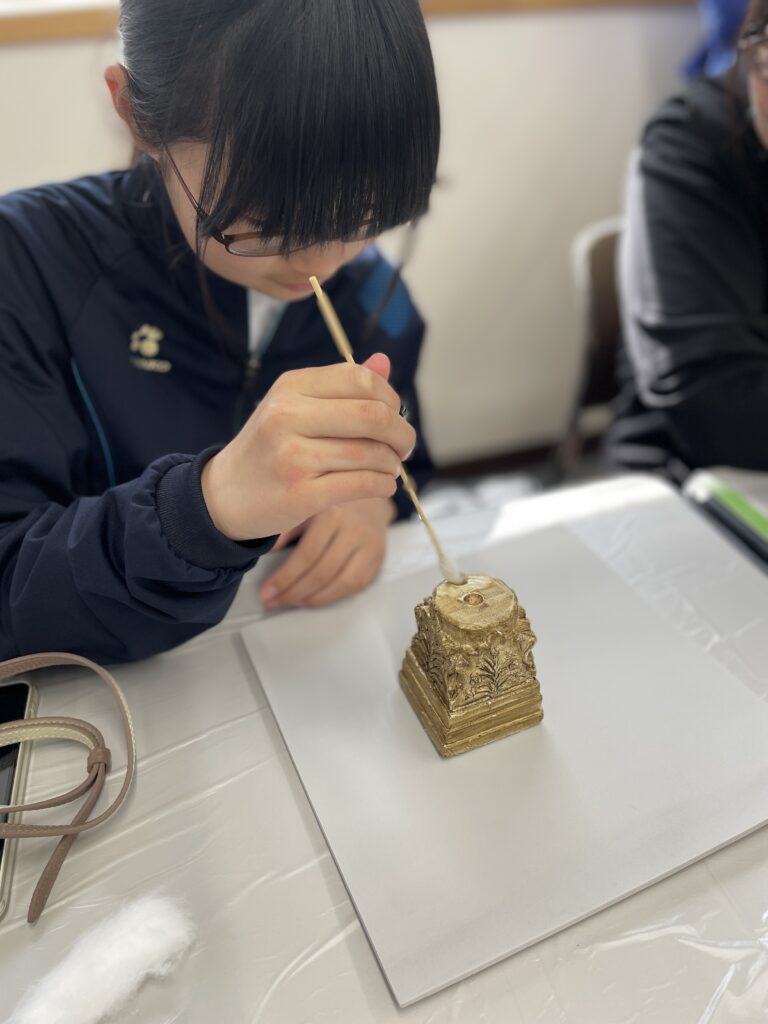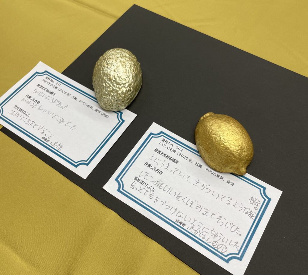 特に印象的だったのは、金箔のクリーニングをしていた子の気づきです。石膏で作ったレモンやアボカドに施した金箔層の下には、金箔の発色を良くするための黄色い絵具層があります。クリーニングの途中で、黄色いものが見えてきて「あれ、どっちがもともとだったのか?」とその子は疑問を持ったのですが、これは実際の修復現場でも起こることです。どの層がオリジナルなのか、除去するべき層より下の層を除去していないかを見極めるには、丁寧な観察が欠かせません。良く見ず機械的に手を動かしていると、大切なオリジナルを取り除いてしまう可能性もあります。