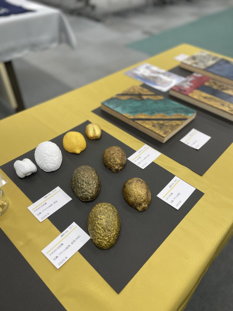 クリーニング前の作品写真;石膏に金箔を貼ったアボカドとレモン