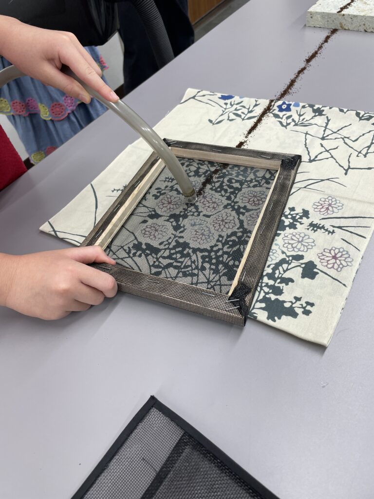 布は吸い取らないように木枠のあるネットで押さえる